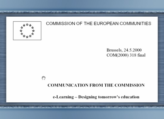 2000. március 9-én az Európai Bizottság akkori kulturális és oktatási ügyekért felelős tagja ismertette az eLearning kezdeményezést. Ekkor az e-learning még tágabb összefüggésrendszerben jelenik meg, egymáshoz lazán kapcsolódó normatív elvárások összefoglaló fogalmaként. Ez az átfogó, szélesebb körű értelmezés magában foglalja az oktatási rendszereknek az új IKT hatására történő átalakítását és a tanulás számítógépes integrációját. Az e-learning az oktatás hagyományos formáival szembeni alternatívaként jelenik meg. Jelentésmezejébe beletartozik a jövőirányultság, és megítélése nem elsősorban a mai teljesítőképessége, hanem a jövőbe vetített lehetőségei alapján történik. Innen vezethető le a hagyományos oktatási gyakorlatot átformáló hatásának feltételezése is. Az eLearning kezdeményezés a következő elérendő célokat jelölte meg: az IKT iskolai implementációjának elősegítése, a digitális írástudás terjesztése, új tanulási kultúra kialakítása, széleskörű hozzáférés biztosítása a tanulási lehetőségekhez, jó minőségű elektronikus tartalmak stb.